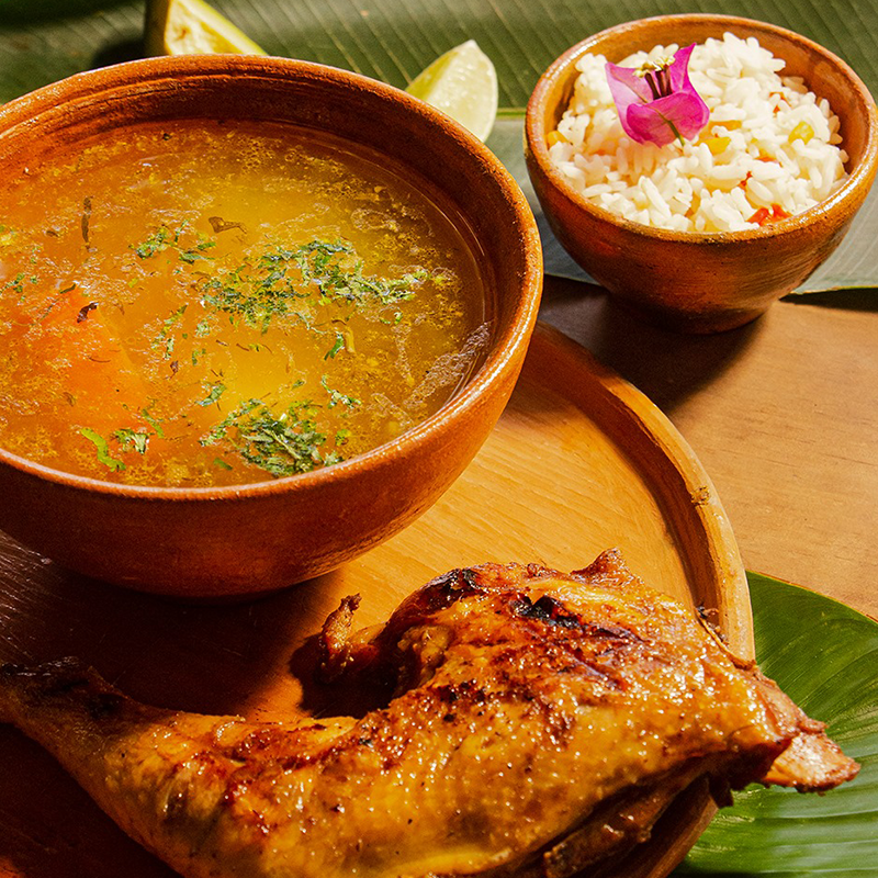 El caldo de gallina es uno de los platillos más apreciados de la cocina guatemalteca, famoso por su sabor profundo y su carácter festivo. Preparado con gallina criolla cocida lentamente hasta lograr un caldo dorado y aromático, se acompaña con verduras frescas como güisquil, papa, zanahoria y elote. Servido con arroz, chile y tortillas recién hechas.